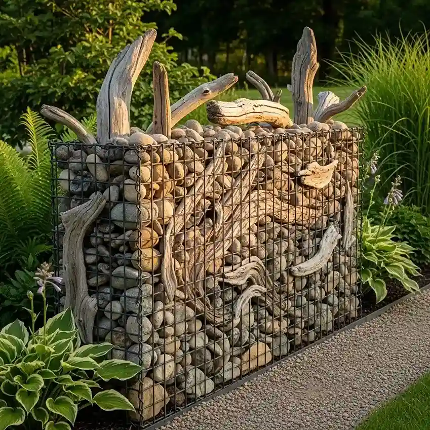 | Best Gabion Fill | Mix of river stones and driftwood pieces |