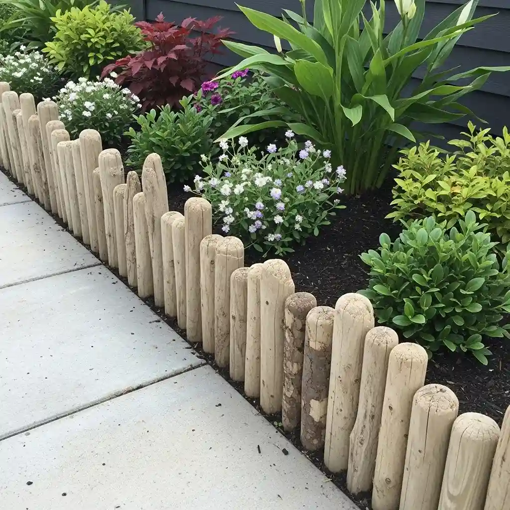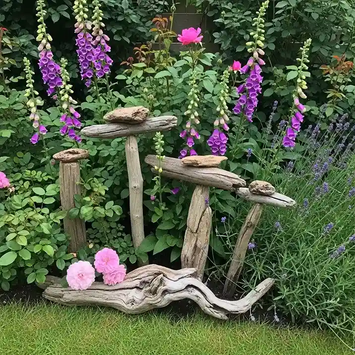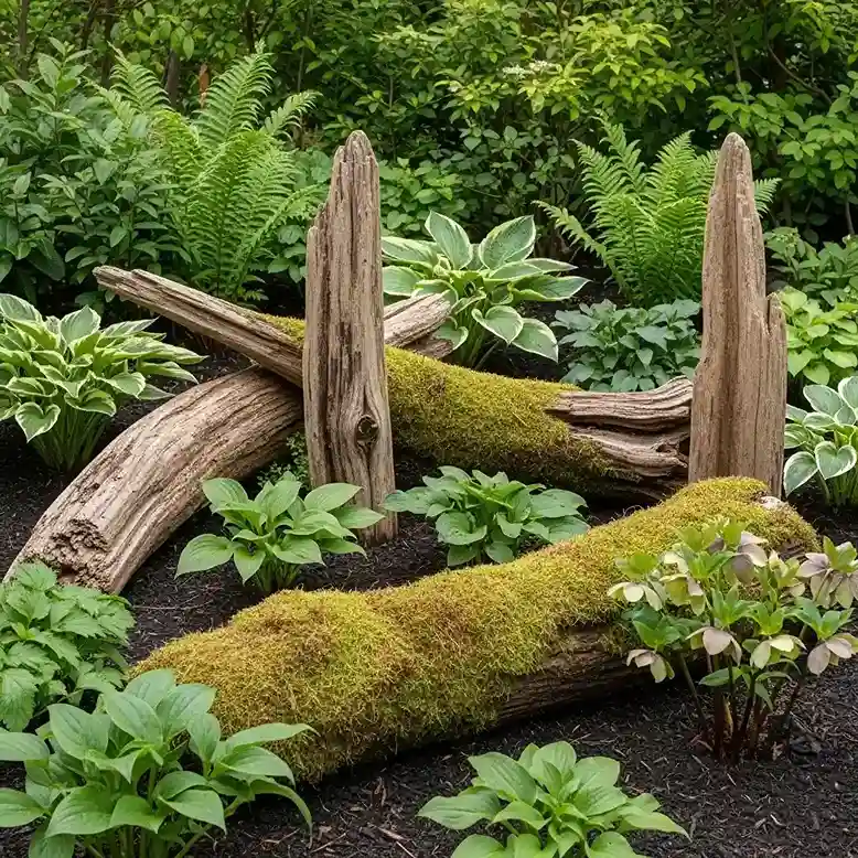 Using pieces of driftwood as natural border edging along flower beds and pathways creates a beautifully rustic, organic boundary that frames your plantings elegantly without the stiffness of traditional metal or plastic edging materials.