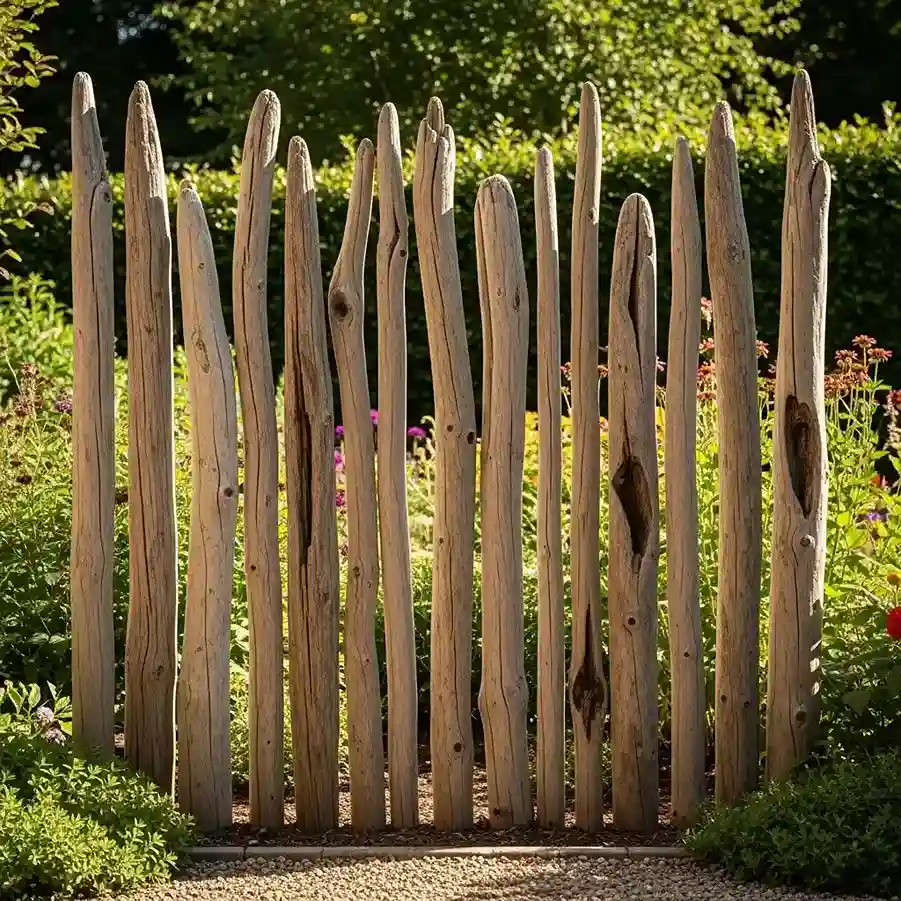 Arranging tall pieces of driftwood vertically in a row creates a beautifully organic, natural-looking privacy screen that divides garden spaces, blocks unwanted views, and adds a striking sculptural element to any outdoor area simultaneously.