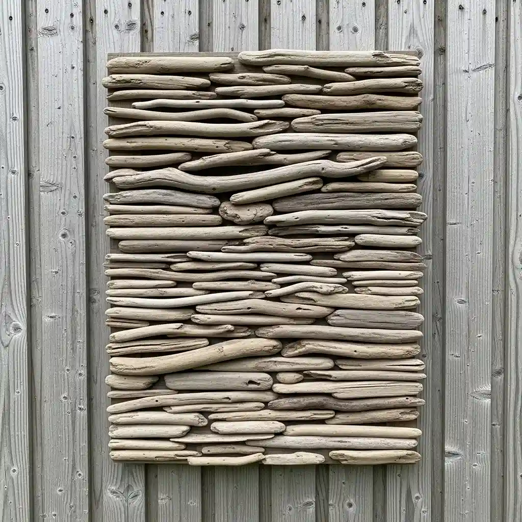 Combining driftwood pieces on a backing board in a pallet-style arrangement creates a unique, handcrafted piece of garden wall art that celebrates the natural beauty of weathered wood in a structured, contemporary format.