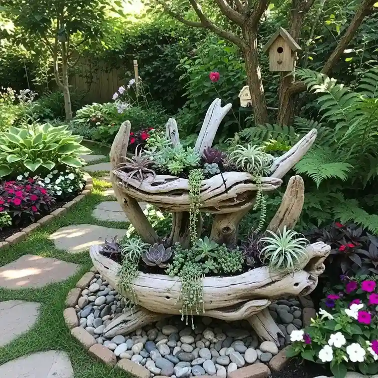 Driftwood art is actually particularly well-suited to small gardens because individual pieces can create enormous visual impact without taking up significant space. A single sculptural piece used as a focal point, a driftwood planter filled with trailing succulents, or a small wall-mounted art installation can all transform a compact outdoor space dramatically.