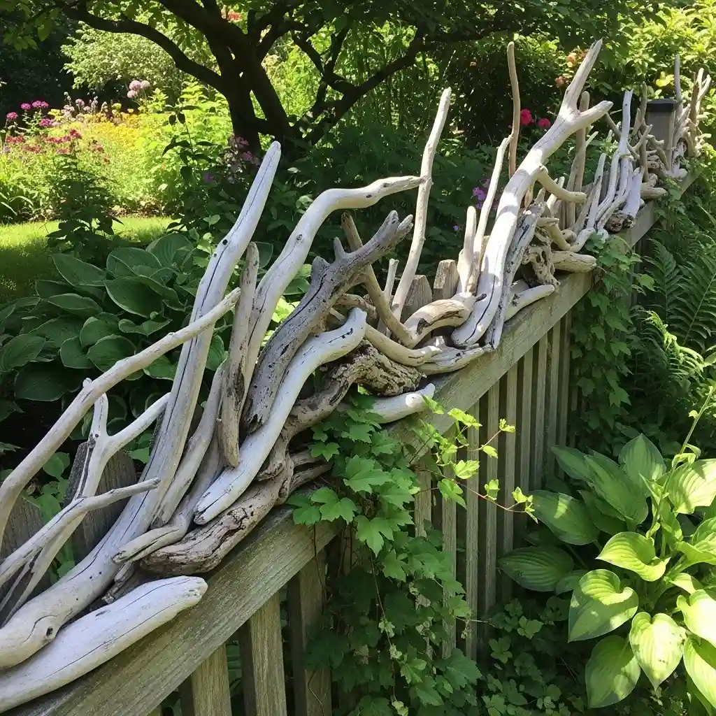 Attach driftwood pieces at varying heights and angles along fence panels, mixing sizes and shapes to create a dynamic, flowing composition that looks intentional yet beautifully organic. For more fence line planting and decoration ideas, our fence line landscaping guide provides excellent complementary inspiration.
