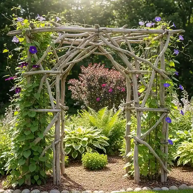 A handcrafted driftwood trellis creates a beautifully rustic support structure for climbing plants that looks far more characterful and interesting than any mass-produced metal or plastic alternative ever could in a natural garden setting.