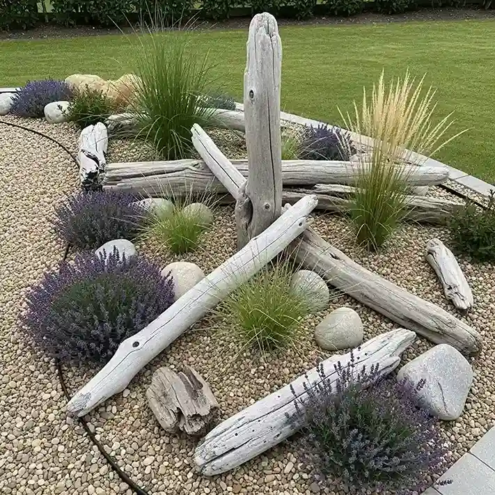 A driftwood coastal garden feature combining bleached wood, pebbles, ornamental grasses, and sea lavender brings the effortless beauty of the beach directly into your garden, creating a serene, nature-inspired outdoor retreat full of character.