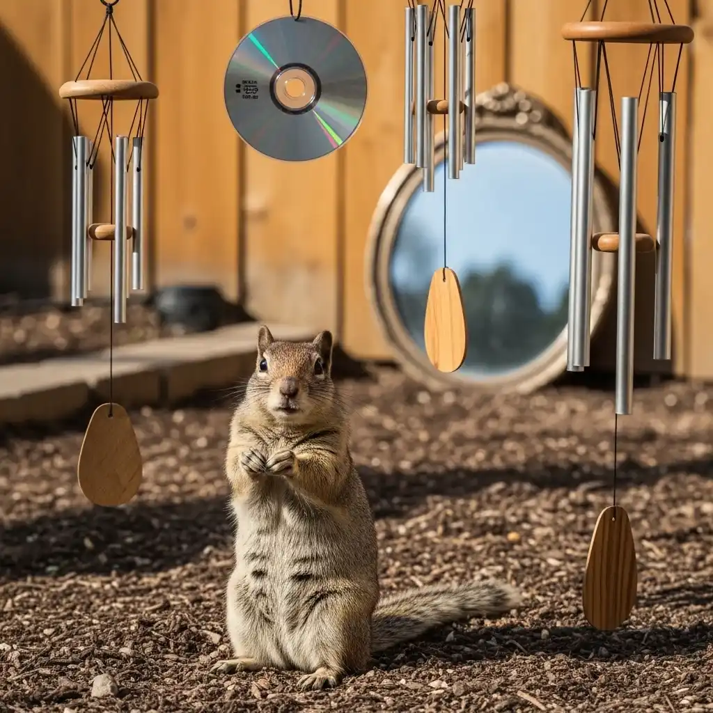 Ground squirrels are highly visual and easily spooked by sudden flashes of light or movement. This fits perfectly into a hippie garden bohemian outdoor aesthetic that uses wind chimes and mirrors.