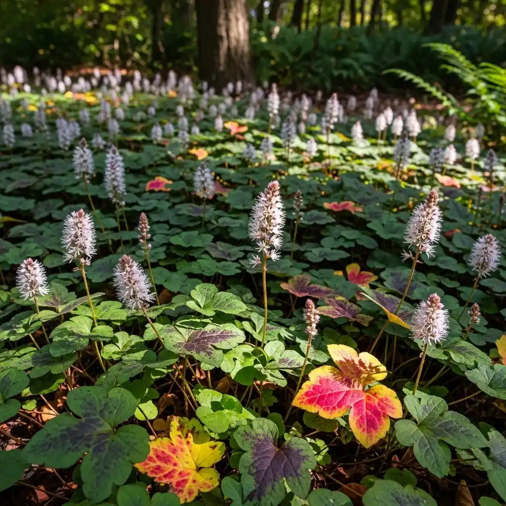 Foamflower produces fuzzy white or pink flower spikes in spring above attractive mapleleaf-shaped foliage creating native groundcovers. These low-growing perennials spread through runners forming dense mats suppressing weeds while providing continuous foliage interest. Many varieties offer burgundy leaf markings and color-changing fall foliage adding multi-season appeal beyond spring flowering.