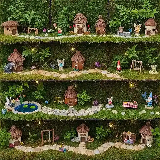 Vertical gardening provides the perfect “cliffside” backdrop for miniature landscapes. You can use tiered shelving to implement fairy garden ideas at multiple levels.