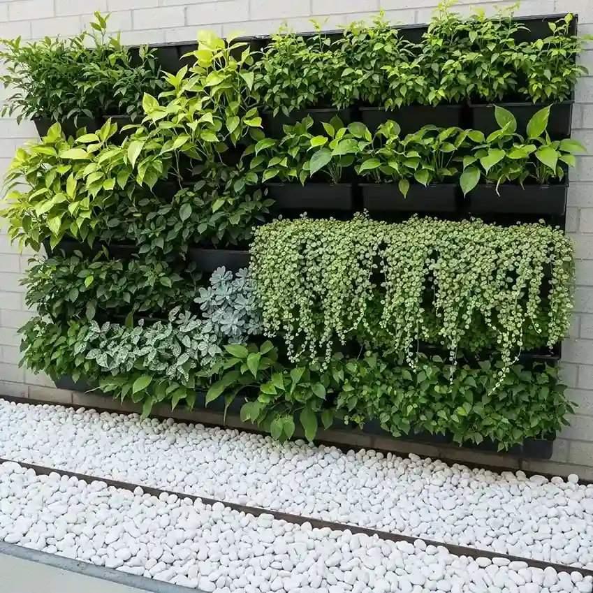 To make your vertical garden truly pop, consider the ground beneath it. Using white stone landscaping ideas at the base of a green wall creates a high-contrast, professional look.