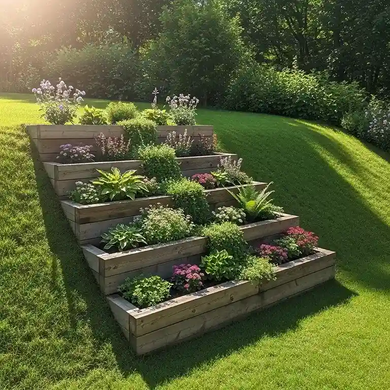 Slopes are notoriously difficult to landscape, but verticality makes it easier. Utilizing sloped backyard ideas on a budget like terraced planters allows you to stack greenery up the hillside.