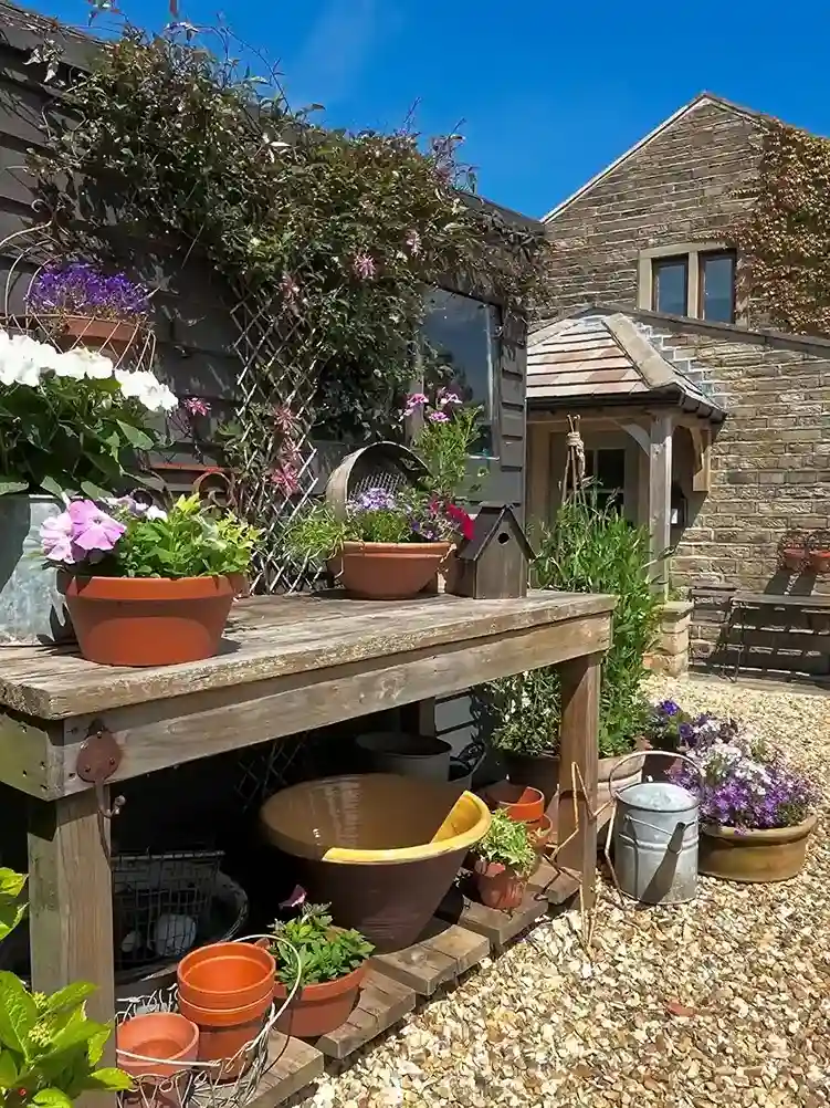 Every vintage garden needs a dedicated space for potting, arranging flowers, and tending plants. This work area becomes a garden room in itself—practical and full of character.